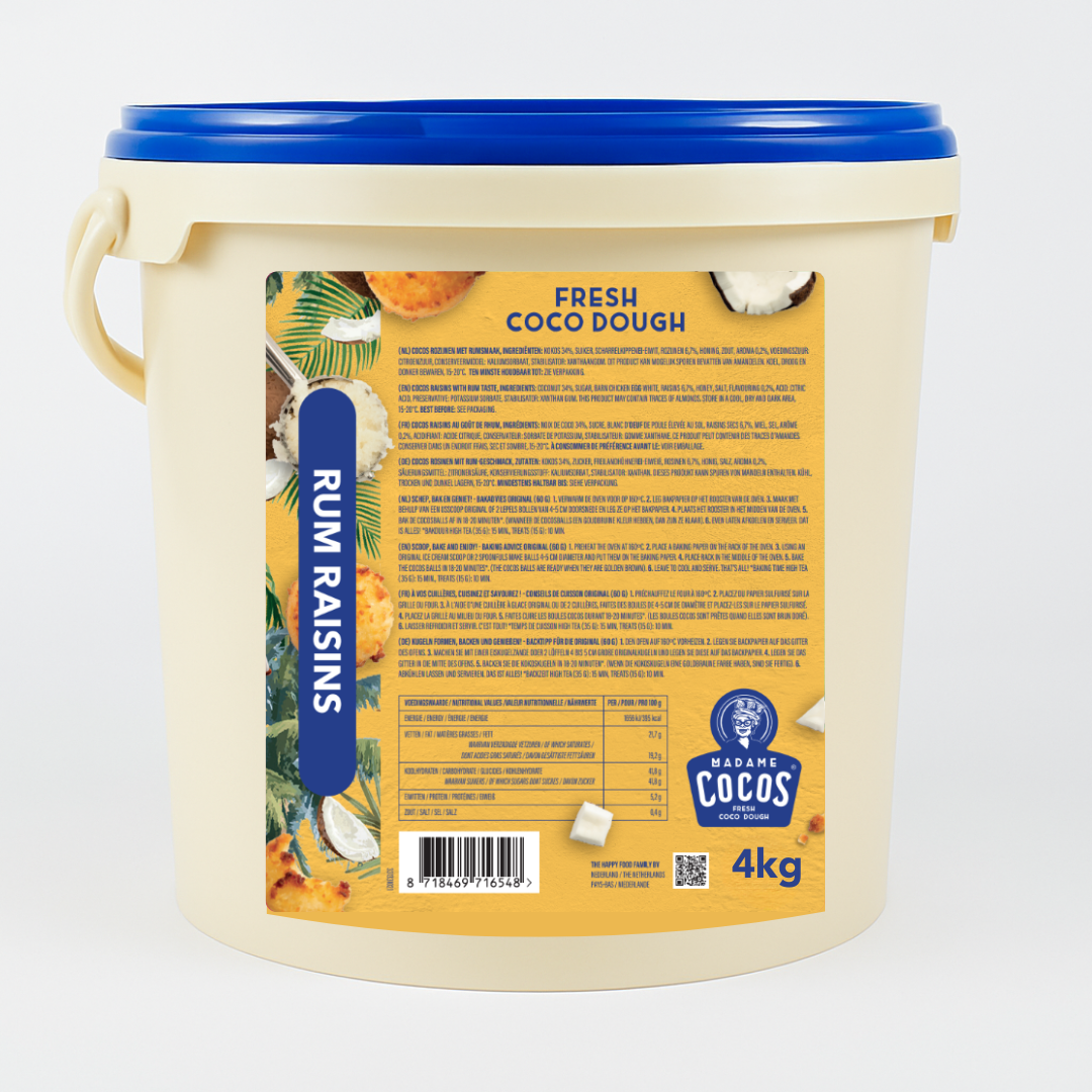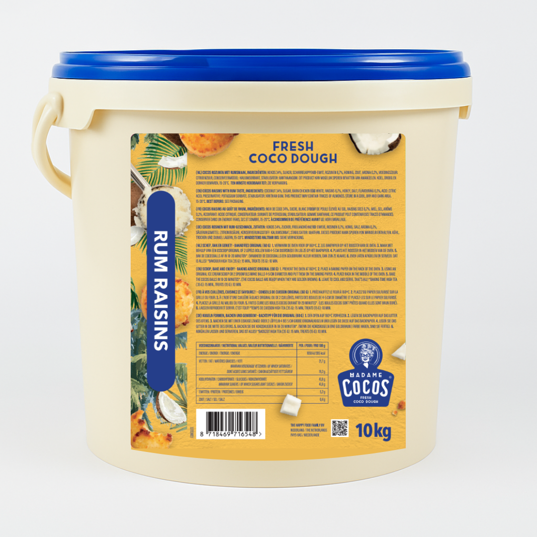 Kokos 34%, Suiker, Scharrelkippenei-eiwit, Rozijnen 6,7%, Honing, Zout, Aroma 0,2%, Voedingszuur: Citroenzuur, Conserveermiddel: Kaliumsorbaat, Stabilisator: Xanthaangom. Dit product kan mogelijk sporen bevatten van amandelen.